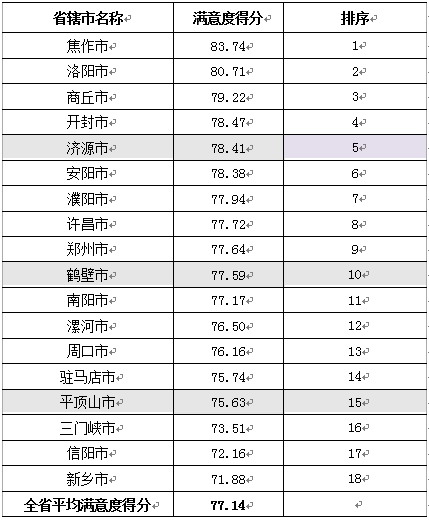 河南省18個省轄市旅游公共服務(wù)滿意度得分排序
