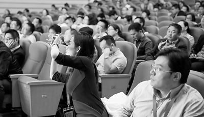 9月28日,參加論壇的與會來賓,拿出手機拍照。胡敬超攝