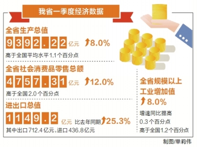 相較于年初省政府工作報告提出的今年經(jīng)濟增長7.5%以上的目標(biāo),一季度我省經(jīng)濟運行狀況好于預(yù)期。