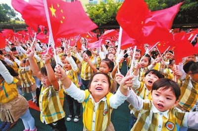 開封市群英幼兒園的小朋友手舉國旗歌頌祖國,孩子們的笑臉與鮮艷的五星紅旗交相輝映。