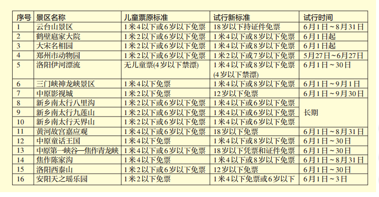 河南16家景區(qū)試行兒童票收費新標準