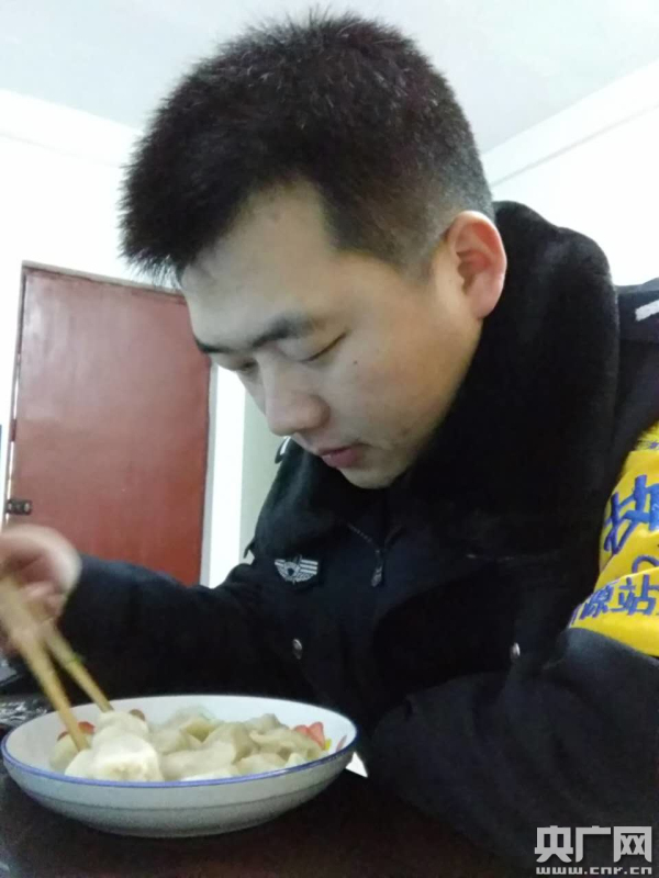 忙碌了一天民警李遠(yuǎn)亮吃碗餃子過年了