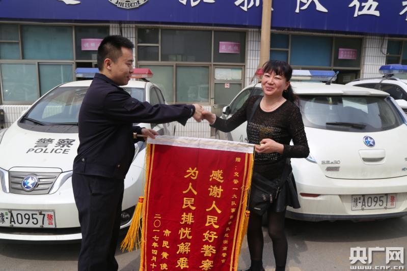 央廣網(wǎng)河南分網(wǎng)4月24日消息(本網(wǎng)特別報(bào)道組)?“我都沒想到還能找到肇事車,真是太感謝了!”4月24日上午11時(shí)許,在鄭州交警一大隊(duì)院內(nèi),市民黃女士把一面繡有“感謝人民好警察,為人民排憂解難”的錦旗遞到事故中隊(duì)民警趙浙南手里,并不住地說著謝謝。