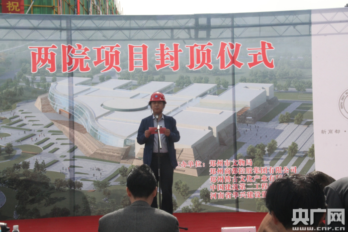 央廣網(wǎng)河南分網(wǎng)消息 4月20日上午,鄭州商都遺址博物院和鄭州市文物考古研究院建設(shè)項(xiàng)目施工現(xiàn)場(chǎng)彩旗飄揚(yáng),在熱烈的掌聲中,項(xiàng)目迎來(lái)了激動(dòng)人心的主體工程封頂儀式。來(lái)自鄭州市文物局、管城回族區(qū)政府、東大街街道辦事處、鄭州商都控股集團(tuán)、鄭州博古文化產(chǎn)業(yè)有限公司、河南省華興建設(shè)監(jiān)理有限公司的領(lǐng)導(dǎo)和嘉賓,以及勞務(wù)公司代表、項(xiàng)目全體員工等100余人參加了封頂儀式。鄭州市文物局局長(zhǎng)任偉出席儀式并發(fā)表講話,中建二局二公司中原分公司經(jīng)理崔彥波代表施工單位參加儀式。