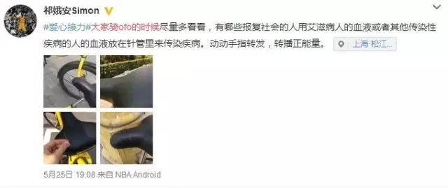 5月底,網(wǎng)上流傳圖片稱,有人在一輛共享單車的坐墊上找到一根針,似有人故意為之。“騎車的時(shí)候請(qǐng)注意查看,有些艾滋病患者把自己的血染到針頭上,要是被扎到你就被感染了!
