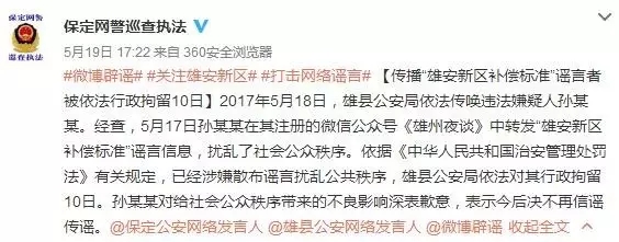 真相:所謂的“補(bǔ)償標(biāo)準(zhǔn)”是一則不折不扣的謠言。此前,河北雄安新區(qū)臨時(shí)黨委、籌委會(huì)發(fā)布題為《堅(jiān)持“以人民為中心”的理念認(rèn)真制定好土地征遷政策》的明白紙。明白紙?zhí)岢觯壳,新區(qū)土地征遷工作正處于調(diào)查摸底、征求意見階段,新區(qū)籌委會(huì)尚未以任何形式發(fā)布過任何內(nèi)容的“征遷標(biāo)準(zhǔn)”。5月20日,雄縣公安局依法對(duì)涉嫌傳播“雄安新區(qū)補(bǔ)償標(biāo)準(zhǔn)”謠言信息的孫某某做出行政拘留10日的處罰決定。