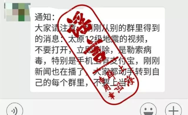5月中旬,一則“‘太原12級(jí)地震視頻’帶有勒索病毒”的消息在微信群中大肆傳播:“大家請(qǐng)注意,剛剛從別的群里得到的消息:太原12級(jí)地震的視頻,不要打開,立即刪除,是勒索病毒,特別是手機(jī)上有支付寶的。剛剛新聞也在播了,大家都動(dòng)手轉(zhuǎn)到自己的每個(gè)群里,不要上當(dāng)!