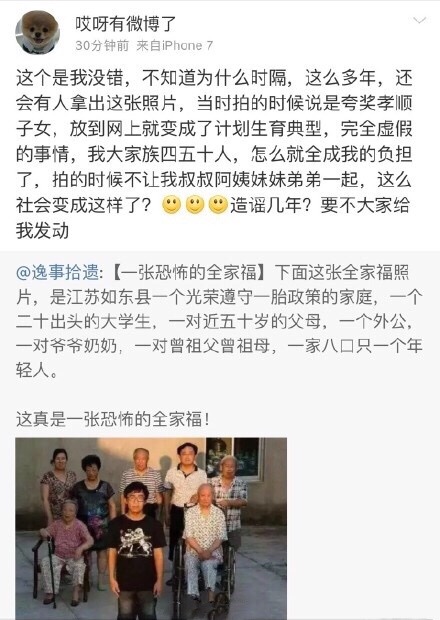 真相:照片中這位“唯一”的年輕人@哎呀有微博了 通過個(gè)人微博辟謠表示,家中并不是僅有這幾個(gè)人,自己還有兄弟姐妹、叔叔阿姨,整個(gè)家族加起來有四五十人。至于這張照片,是幾年前為了宣傳孝順老人而配合拍攝,沒讓其叔叔阿姨妹妹弟弟出鏡。
