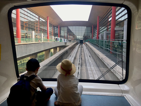 首都機(jī)場(chǎng)T3航站樓,前往國(guó)際登機(jī)口的小火車(chē)上,兩個(gè)孩子并排坐著看著外面。一到假期,首都機(jī)場(chǎng)每天進(jìn)出港人數(shù)達(dá)到幾十萬(wàn),其中許多是中小學(xué)生前往世界各地。笑槑/攝