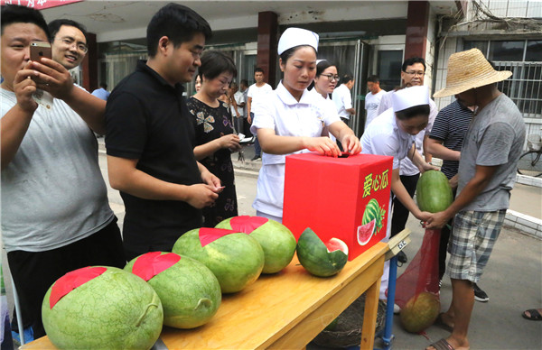 “這瓜肯定好吃,我看你們醫(yī)生護士都在買,給我也來兩個大西瓜吧!”路過的群眾也停下腳步加入了助賣“愛心西瓜”的隊伍, “你們先嘗嘗俺種的西瓜,看看甜不甜、好吃不好吃。” “這瓜看著不錯,吃著也怪甜的,給俺裝三個西瓜!薄袄仙辏憬o我也裝十個西瓜,放家慢慢吃......”醫(yī)生護士們溫馨有序地購買著“愛心西瓜”。