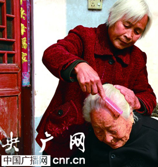 趙枝妮在給婆婆梳頭