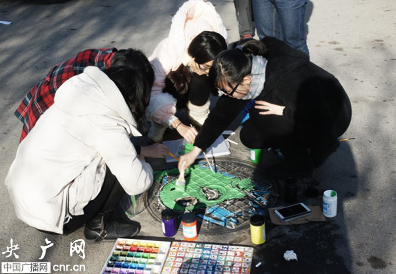 據(jù)了解,同學(xué)們在作畫之間,要先給井蓋作清洗工作,井蓋干凈后才能創(chuàng)作。為了防止畫沒干前被踩踏,大家要在一旁守候,直到井蓋干燥為止。通常情況下,創(chuàng)作一個(gè)井蓋要花費(fèi)一個(gè)多小時(shí)。盡管外面很冷,但同學(xué)們聽到過往師生們的贊揚(yáng)還感到很有成就、很滿足。