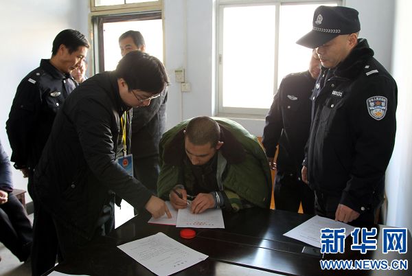 12月13日,被告人閔擁軍(右三)在信陽(yáng)市光山縣看守所內(nèi)簽收判決書。