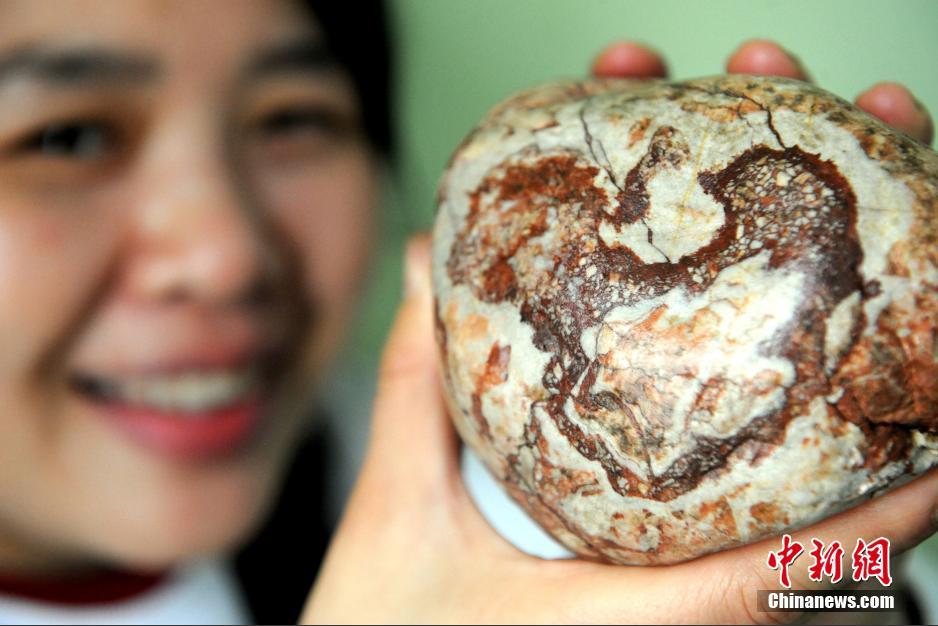 央廣網河南分網消息 據中國新聞網報道:1月9日,福建省福州市一奇石收藏者展示“中國地圖”奇石。這枚鵝卵石上天然形成了一個寬8厘米、高6.6厘米的紅褐色圖案,外形酷似一幅中國大陸版圖。這枚鵝卵石是20多年前在甘肅省和政縣廣通河河畔發(fā)現的,重1.39公斤,質地堅硬、色澤艷麗、紋理清晰、橢圓秀美。(張晴 攝)