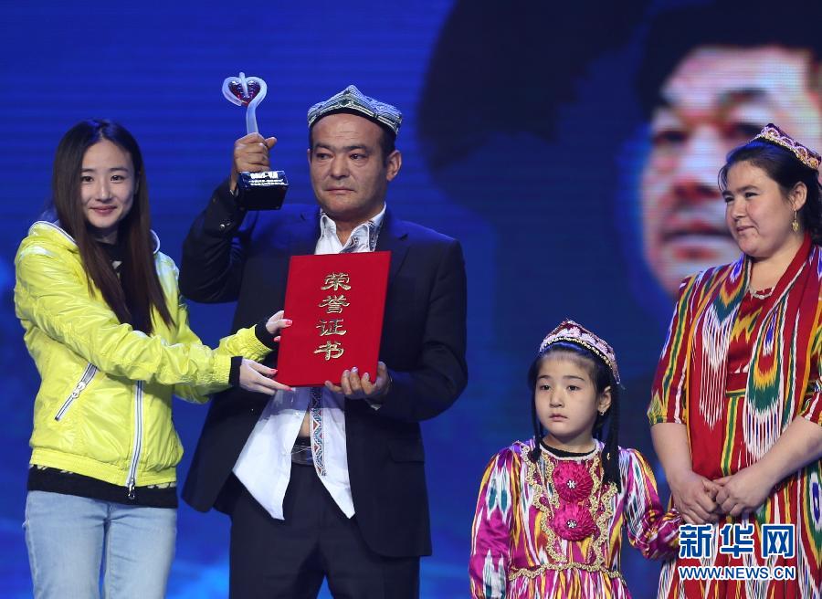 1月9日,著名運動員桑雪(左一)給22年堅持行善助人的阿不力孜(左二)頒獎,阿不力孜的身旁是他的家人。