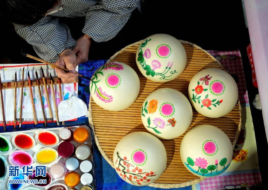 1月15日,在山東省萊州市朱橋鎮(zhèn)賈家村,村民用食用染料描繪花餑餑。