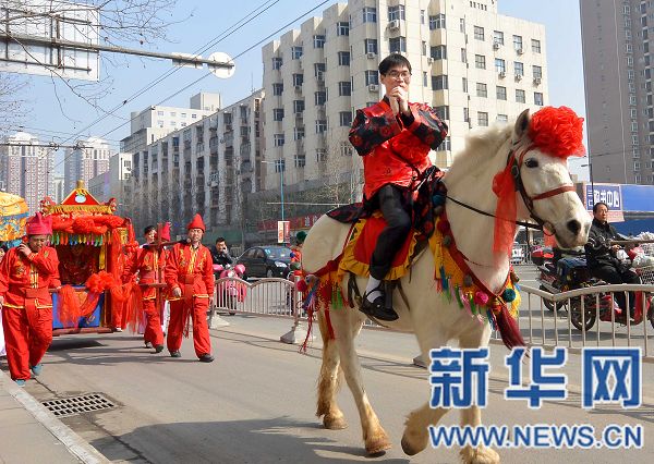央廣網河南分網消息 據新華網河南頻道報道:當日,在鄭州市區(qū),一支花轎迎親隊伍格外惹眼。整個婚禮儀仗隊有40余人,新郎騎白馬,喜娘坐花轎,吹吹打打,招搖過市,向路人展示熱鬧、喜慶的中式傳統(tǒng)婚俗文化。
