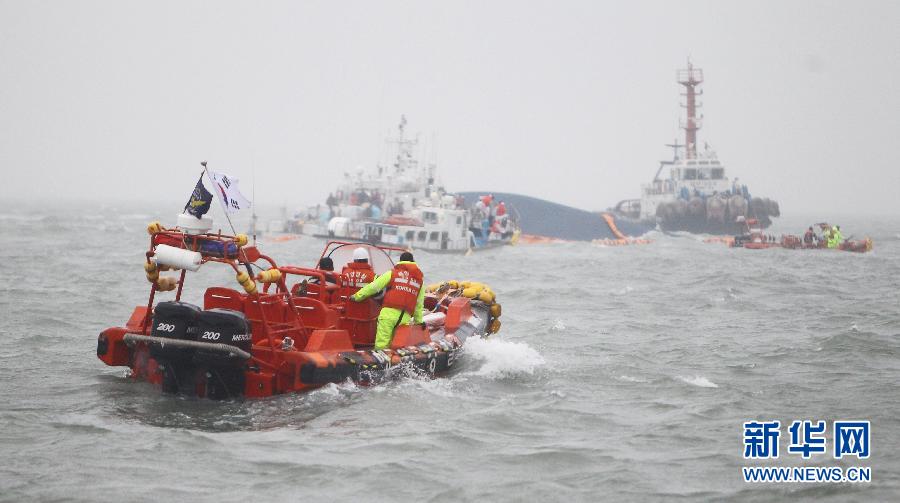 4月17日,救援人員在韓國全羅南道珍島港口附近海域的沉船地點(diǎn)搜救韓國“歲月”號(hào)客輪上的乘客。(新華社記者姚琪琳攝)