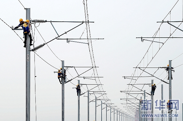 5月8日,工人在鄭焦城際鐵路黃河大橋引橋上調(diào)試接觸網(wǎng)腕臂。