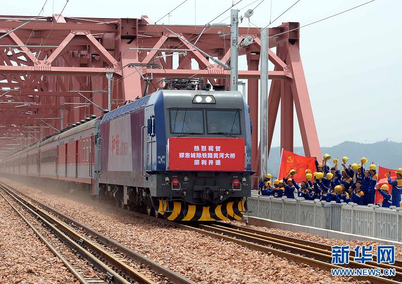 5月16日,鐵路工人在向穿過鄭焦城際鐵路黃河大橋的第一輛客運列車歡呼致意。