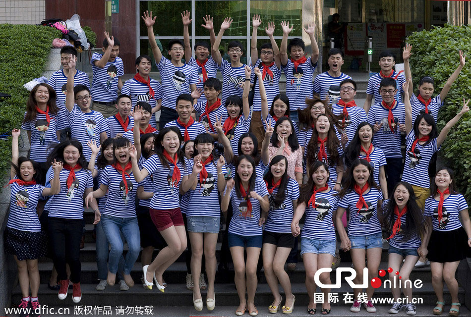 2014年5月16日,湖南省郴州市湘南學院的經(jīng)濟與管理學院2010級國際經(jīng)濟與貿(mào)易專業(yè)二班的畢業(yè)就是照與眾不同,他們衣著永不過時的海紋紗和紅領巾的同學們風趣地說,我們不是“一般人,我們是二班人”,四年的專業(yè)學習,他們有的考上了其他大學的研究生,有的將要走向新的工作崗位。這不,他們是時代的弄潮兒。圖片來源:劉衡/東方IC