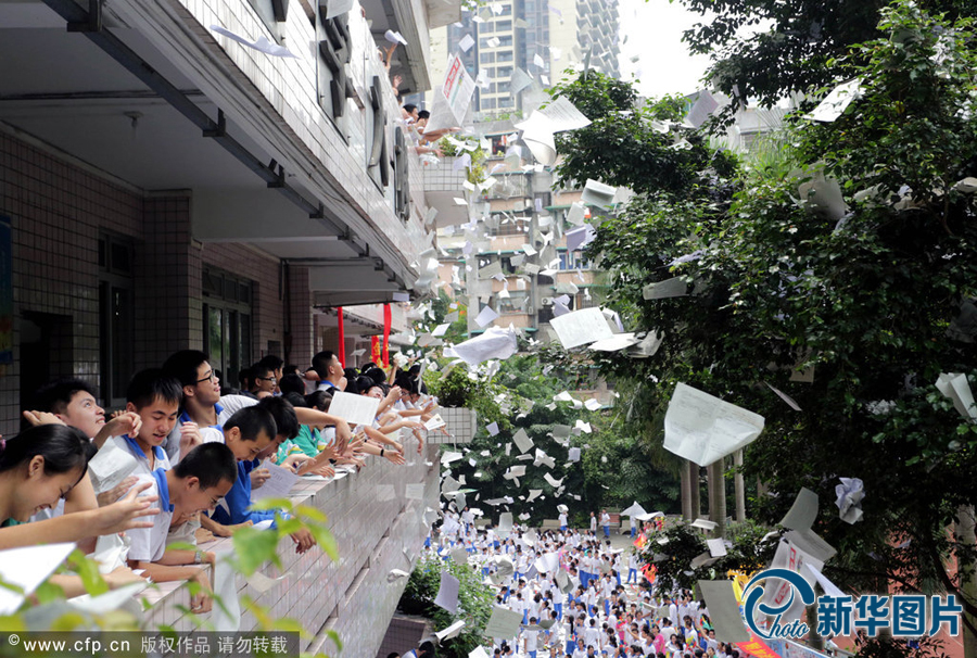 2014年06月04日上午,廣州市,廣州大學(xué)附屬中學(xué)高三、初三學(xué)生將廢棄試卷扔出教室,釋放壓力,迎接即將到來的考試。