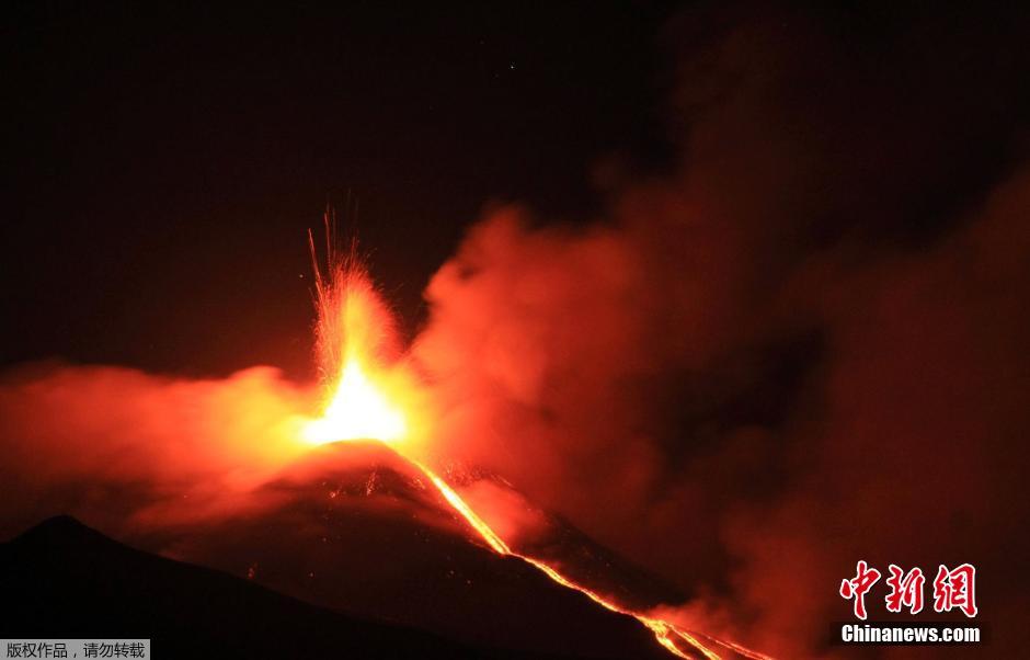 當?shù)貢r間6月15日,意大利西西里島,埃特納火山再次噴發(fā),現(xiàn)場猶如世界末日,世界一片血紅。