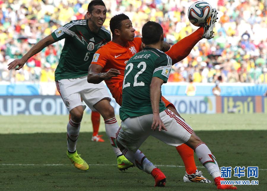央廣網(wǎng)河南分網(wǎng)消息 據(jù)新華網(wǎng)報(bào)道:當(dāng)日,在巴西福塔萊薩卡斯特洛競技場進(jìn)行的2014年巴西世界杯八分之一決賽中,荷蘭隊(duì)以2比1戰(zhàn)勝墨西哥隊(duì),闖入八強(qiáng)。(新華社記者 周磊攝)