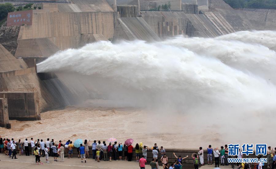 6月30日,游客在黃河小浪底水利樞紐工程觀(guān)看飛瀑景觀(guān)。