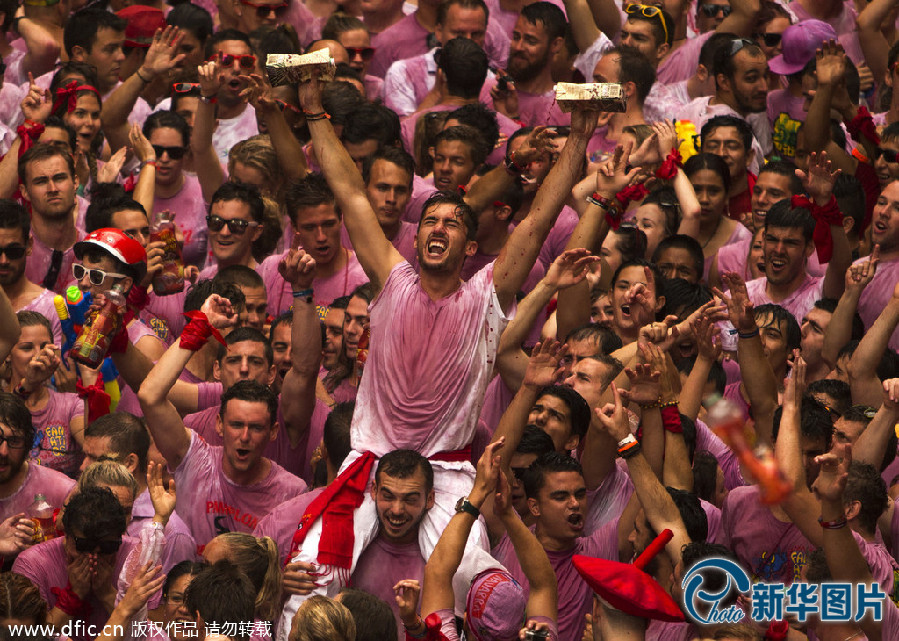 當(dāng)?shù)貢r間2014年7月6日,西班牙潘普洛納,來自世界各地的狂歡者參加奔牛節(jié)開幕儀式。
