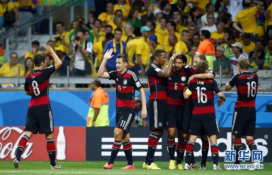 7月8日,德國隊(duì)球員米?克洛澤(左二)進(jìn)球后與隊(duì)友慶祝。當(dāng)日,在巴西貝洛奧里藏特的米內(nèi)羅大球場(chǎng)進(jìn)行的2014年巴西世界杯半決賽中,巴西隊(duì)1-7不敵德國隊(duì)。 新華社記者陳建力攝
