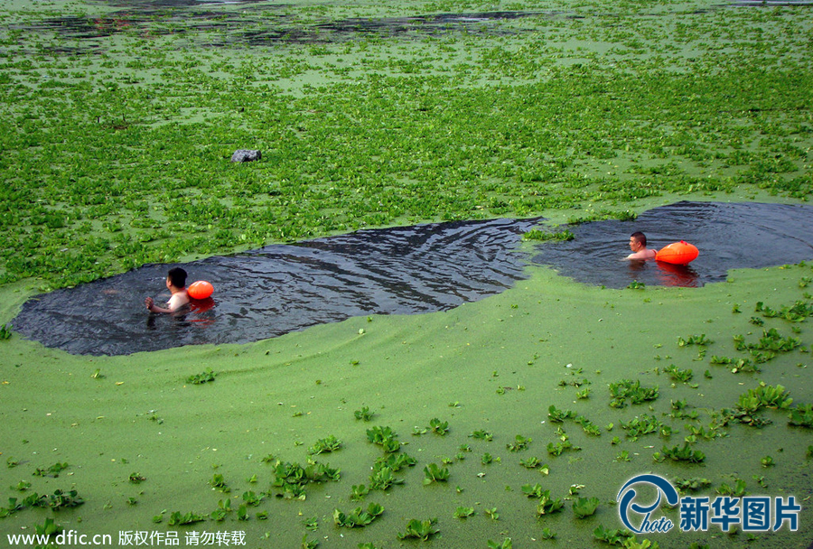 央廣網河南分網消息 據新華網報道:2014年7月10日下午。從漢江上游漂浮而下的浮萍等水生植物至今已持續(xù)存在近一個月之久,目前仍未有消退的跡象。在漢口江漢一橋附近,幾個碼頭周邊水域全被茂盛的水生植物包圍覆蓋。盡管如此,仍有不少愛水的市民在此納涼、戲水、釣魚,成為獨特的都市風景。