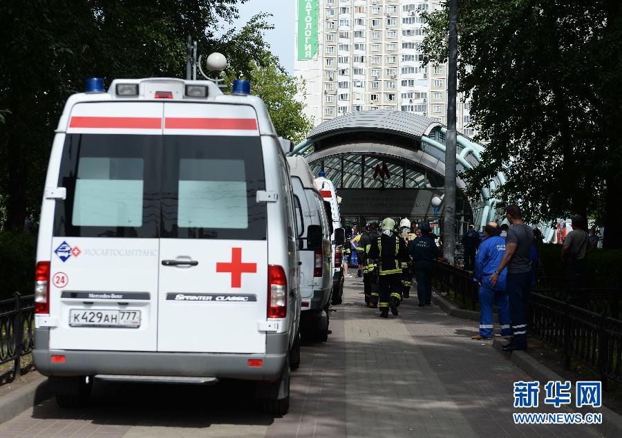 7月15日,在俄羅斯首都莫斯科,一輛救護(hù)車停在莫斯科地鐵“深藍(lán)”線“斯拉維揚(yáng)斯克”站出口附近。 (記者賈宇辰攝)