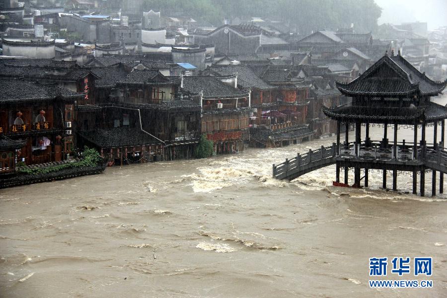 央廣網(wǎng)河南分網(wǎng)消息 據(jù)新華網(wǎng)報(bào)道:7月15日,經(jīng)過一夜暴雨后,鳳凰古城沱江水位上漲,部分商鋪被淹。據(jù)湖南省氣象水文部門監(jiān)測,14日8時至15日8時,湖南全省大部普降小到中雨,部分大到暴雨,局地大暴雨。15日8時,沅水二級支流沱江鳳凰站發(fā)生超警洪水,8時水位304.31米,超警0.81米。新華社發(fā)(章斌 攝)