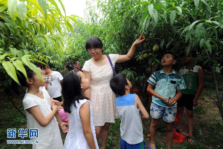 7月17日,在河北廊坊廣陽(yáng)區(qū)南尖塔鎮(zhèn)果園中,家長(zhǎng)在給孩子們講授桃樹(shù)的相關(guān)知識(shí)。