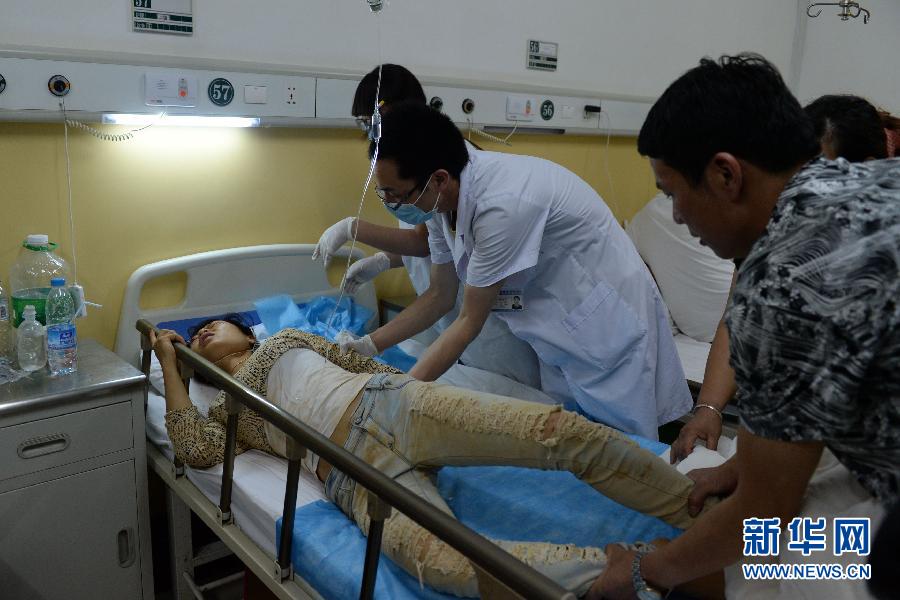 8月3日晚,地震傷員在魯?shù)榭h人民醫(yī)院接受救治。 8月3日16時30分,云南省昭通市魯?shù)榭h發(fā)生6.5級地震,震源深度約12公里。截至8月4日2時,魯?shù)椤?·03”地震已致云南昭通、曲靖兩市共計367人遇難。新華社記者 胡超 攝