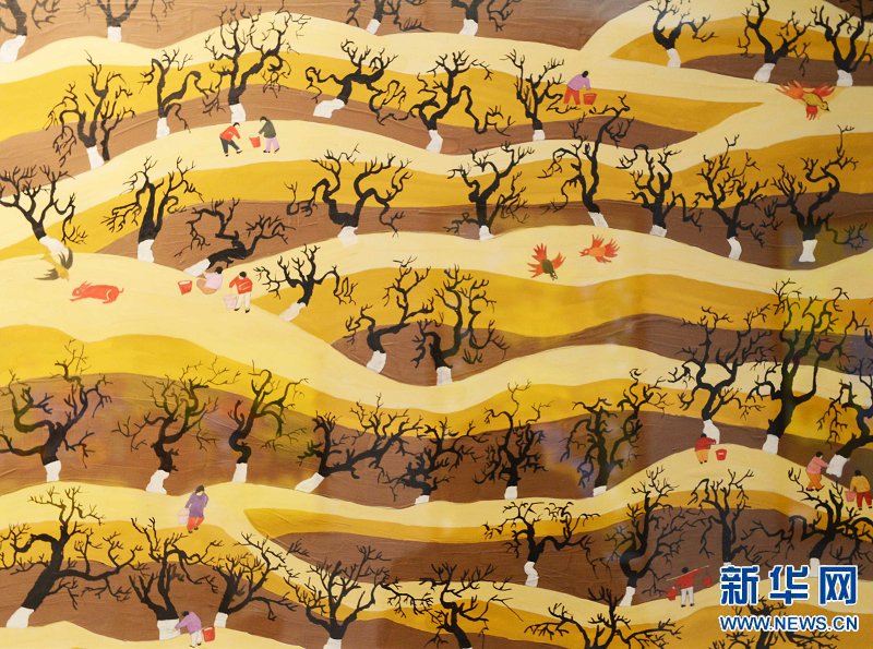 河南農(nóng)民畫(huà)以夸張的形式,集中剪紙、刺秀、木雕、壁畫(huà)等民間藝術(shù)手法,并吸取現(xiàn)代藝術(shù)精華,作品充滿泥土芬芳,獨(dú)具中原特色。(記者 朱祥攝)