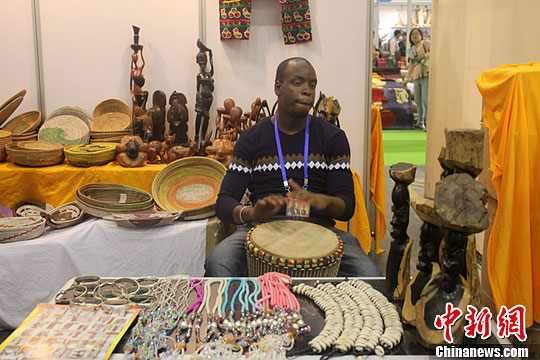圖為鄭交會上,塞內(nèi)加爾的小伙不停地利用手鼓敲打出動人的曲調(diào),希望吸引顧客駐足。馬義恒 攝