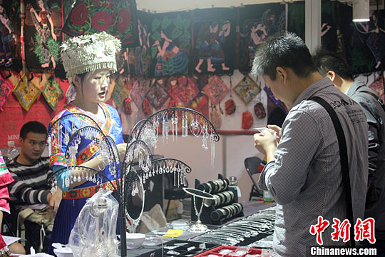 圖為鄭交會上,苗族商家身著民族服裝吸引顧客。馬義恒 攝