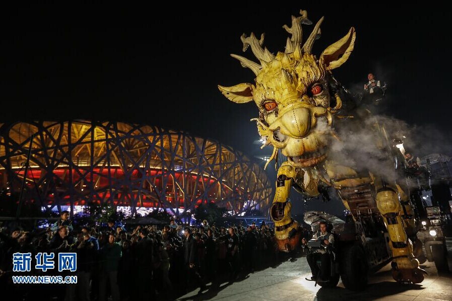 央廣網(wǎng)河南分網(wǎng)消息 據(jù)新華網(wǎng)報(bào)道:自當(dāng)日起至10月19日,紀(jì)念中法建交50周年法國(guó)機(jī)械“龍馬”巡游表演在北京奧林匹克公園中心區(qū)舉行。身高12米、重達(dá)47噸的龍頭馬身神獸將與一只高5.7米、體寬6米、重37噸的機(jī)械蜘蛛“大戰(zhàn)”于鳥(niǎo)巢前。為操作這兩個(gè)龐然大物,每頭巨獸都配備有15個(gè)操縱師,而整個(gè)演出團(tuán)隊(duì)多達(dá)180多人。新華社記者 張玉薇 攝