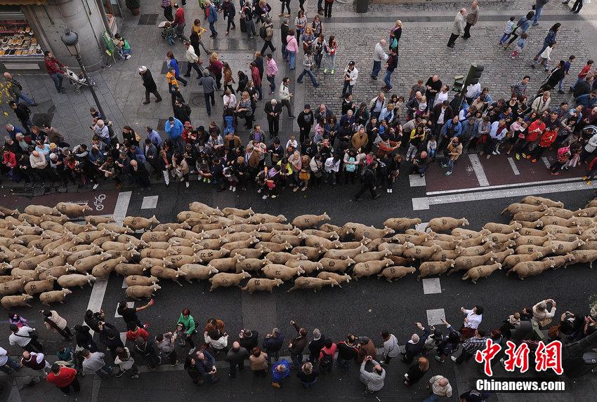 當(dāng)?shù)貢r間2014年11月2日,西班牙馬德里,2000只羊穿過城市中心大街,呼吁加強對季節(jié)性牲畜遷移古道的保護(hù)工作。圖片來源:CFP視覺中國