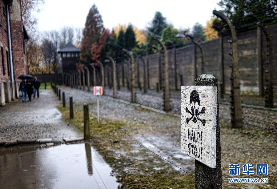 這是奧斯威辛集中營內(nèi)用德語和波蘭語寫的“止步”標(biāo)示(2014年11月8日攝)。 新華社記者金良快攝