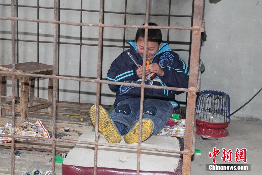 后來,小旺的力氣越來越大,手腕的皮膚被鐵鏈弄得通紅,鐘科福心疼的很。2014年3月,實(shí)在沒辦法的鐘科福請(qǐng)人在家中焊制一個(gè)2平方米的鐵籠,在里面放了兩塊海綿,一個(gè)小木凳,一個(gè)尿桶。為了讓關(guān)起來的小旺能打發(fā)時(shí)間,鐘科福又把別人丟棄的麻將放在鐵籠里供他玩耍!拔乙膊蝗绦倪@樣關(guān)他,學(xué)校不愿意收他,我不出去打零工,家里就揭不開鍋!辩娍聘Uf。