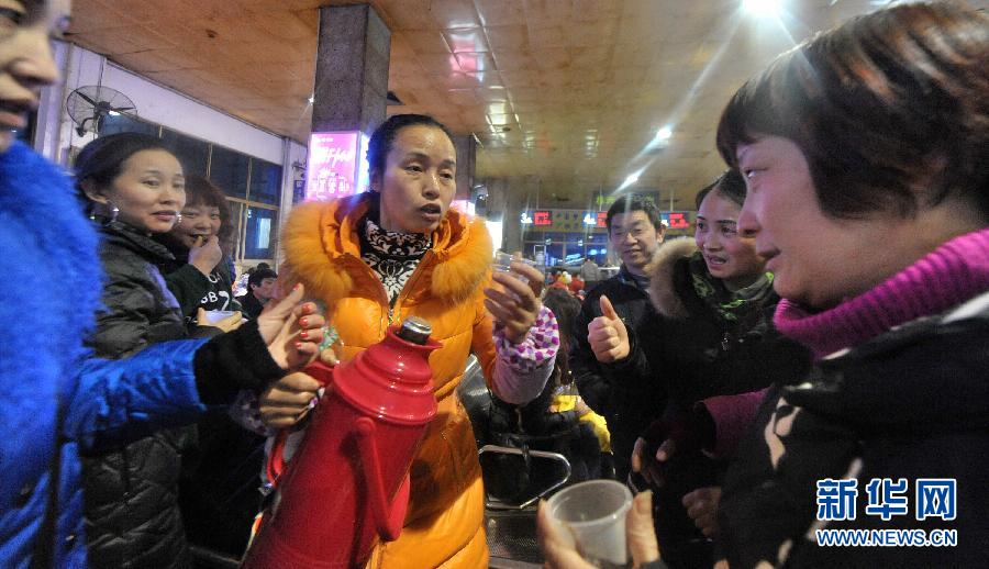 央廣網(wǎng)河南分網(wǎng)消息 2月3日,韓無鹽在告訴乘客姜湯怎么喝最舒服。湖南省株洲市環(huán)保局蘆淞分局的女職工韓無鹽,連續(xù)七年多時間在株洲火車站免費(fèi)給旅客送姜湯,將溫暖傳遞給旅客,被親切地稱為“姜湯大姐”。 “感冒、暈車、咳嗽、身體寒冷的旅客注意啦,這里有免費(fèi)的姜湯!2月3日夜里,記者在株洲火車站候車室看到,“姜湯大姐”韓無鹽右手提熱水瓶,左手提一串一次性杯子,時不時給需要的旅客倒上一杯姜湯。韓無鹽學(xué)過中醫(yī),從2008年初開始,就用姜絲、紅糖、鹽熬成姜湯,無論春夏秋冬,只要沒加班、沒出差,幾乎每天下班后,她都會到火車站送姜湯。據(jù)她介紹,2010年以前,平均每天送出300杯姜湯,近幾年株洲西站和湘潭火車站的開通分流了許多旅客,但每天還是要送近150杯姜湯。粗略計算,7年下來,韓無鹽送的姜湯總量不下50萬杯,溫暖了來往的旅客。談起這些年的堅持,韓無鹽笑著說:“把快樂帶給別人,自己更快樂! 新華社記者 龍弘濤 攝