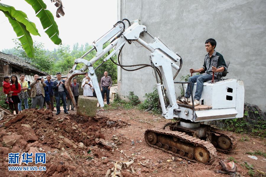 央廣網(wǎng)河南分網(wǎng)消息 5月5日,在四川省內(nèi)江市東興區(qū)柳橋鄉(xiāng)林坡村,代元武操控自制的挖掘機(jī)。近日,內(nèi)江東興區(qū)柳橋鄉(xiāng)林坡村90后小伙代元武自制了一臺(tái)挖掘機(jī),吸引了鄉(xiāng)親們的目光。該挖掘機(jī)是代元武花費(fèi)3個(gè)月時(shí)間設(shè)計(jì)拼裝而成,花費(fèi)約3萬元。他為這臺(tái)小型挖掘機(jī)設(shè)計(jì)了履帶,同時(shí)增添了大小臂伸縮功能,以便于在狹小空間內(nèi)作業(yè),更加適合在農(nóng)村使用。新華社發(fā)(蘭自濤 攝)