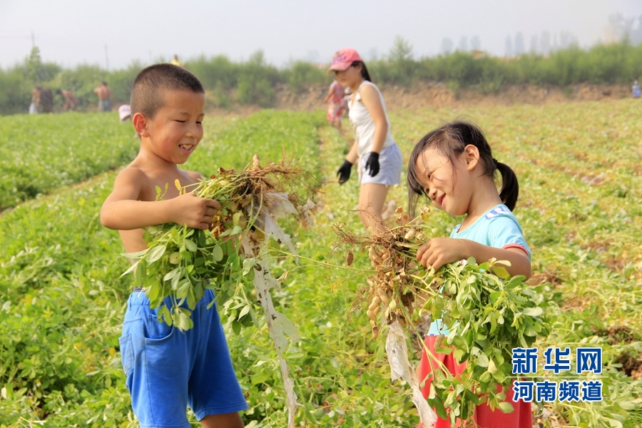 8月16日,河南省內(nèi)黃縣城關(guān)鎮(zhèn)丁莊村的留守兒童在田間地頭幫助家人收花生。