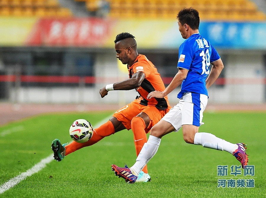 8月16日,貴州人和隊(duì)球員尤里(左)和河南建業(yè)隊(duì)球員張可在比賽中拼搶。