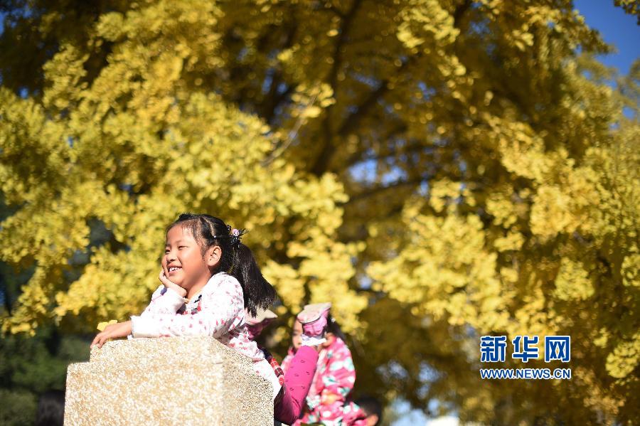 11月1日,一名小朋友在清華大學(xué)校園內(nèi)金黃的銀杏樹下留影。晚秋時節(jié),北京清華大學(xué)校園內(nèi)清華路旁的銀杏樹葉一片金黃,在陽光下飽滿明亮,猶如一幅金色畫卷。 新華社記者 陳曄華 攝