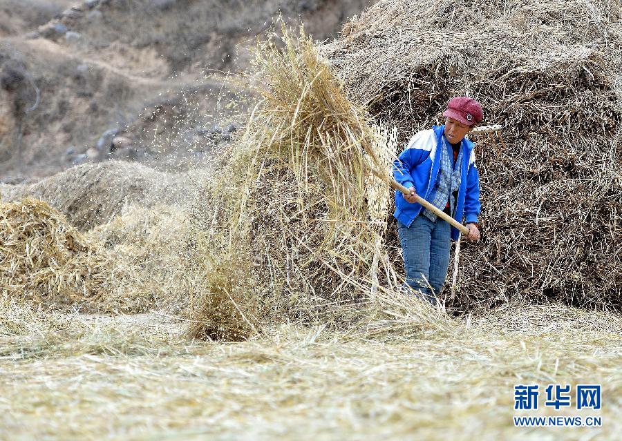 11月3日,和林格爾縣黑老夭鄉(xiāng)昆都侖村一名村民在打場碾壓莜麥。