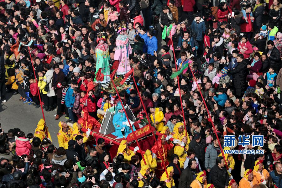 據(jù)介紹,抬閣是集歷史故事、神話傳奇于一體,融繪畫、戲曲、彩扎、紙塑、雜技等藝術(shù)為一身的漢族傳統(tǒng)民俗舞蹈。在木制的四方形小閣里有兩三個人扮飾戲曲故事中的人物,由別人抬著游行。抬閣已被列入國家級非物質(zhì)文化遺產(chǎn)名錄。抬閣的種類繁多,各地抬閣的藝術(shù)形式各有特色 ,以金壇抬閣、徽州抬閣、廣東抬閣、安陽抬閣和山西平陽《抬閣》最為著名。新華網(wǎng)發(fā)(畢興世 馬慶祥攝)